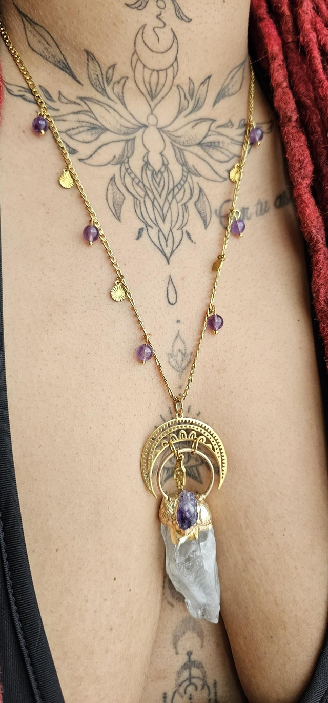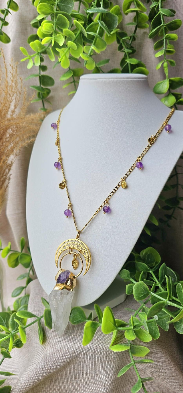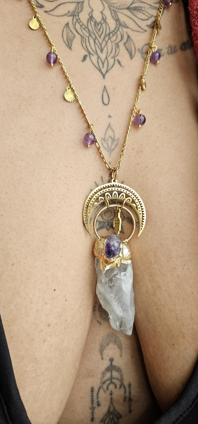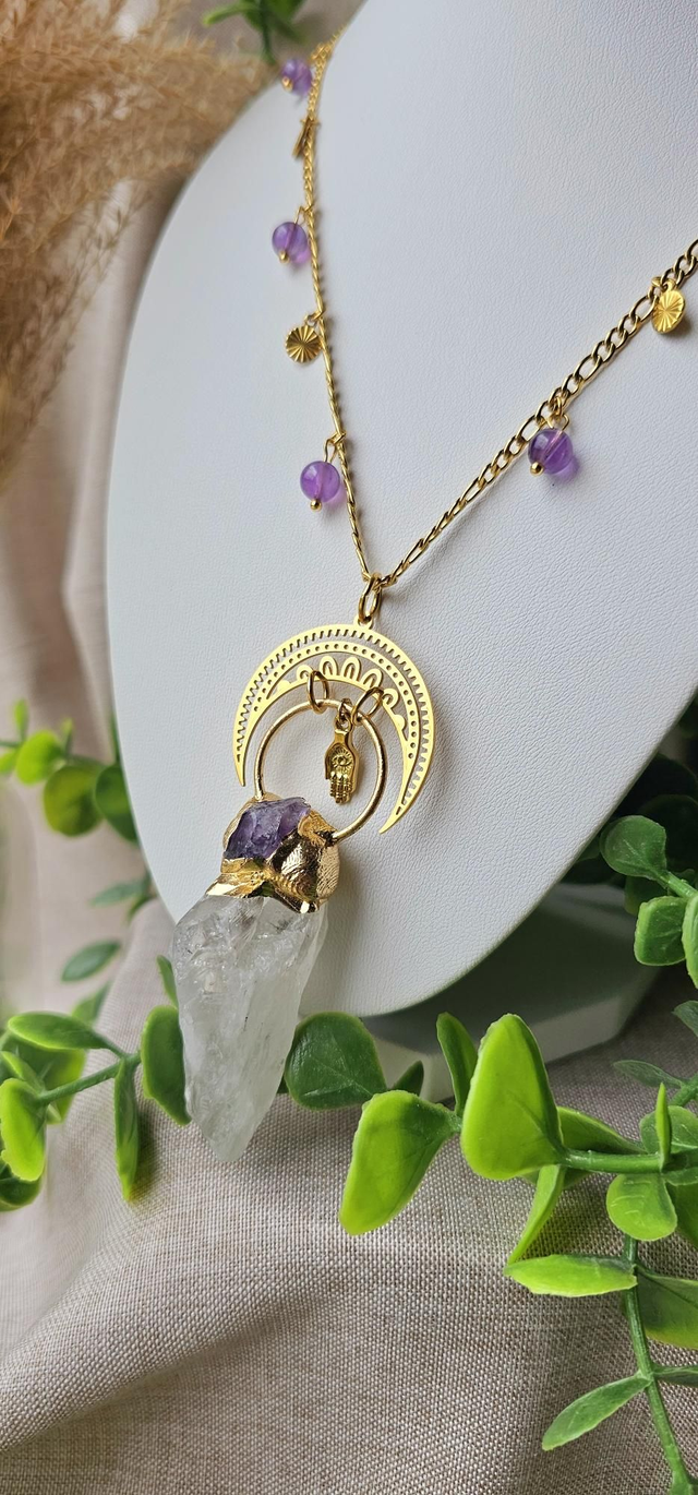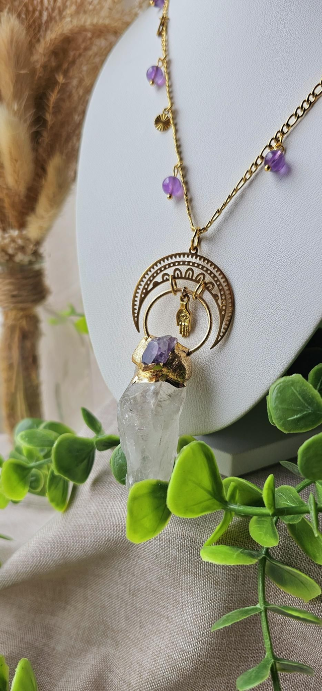 Améthyste et cristal de roche stimule créativité et l'élévation spirituelle. Redonne les sentiments positifs.